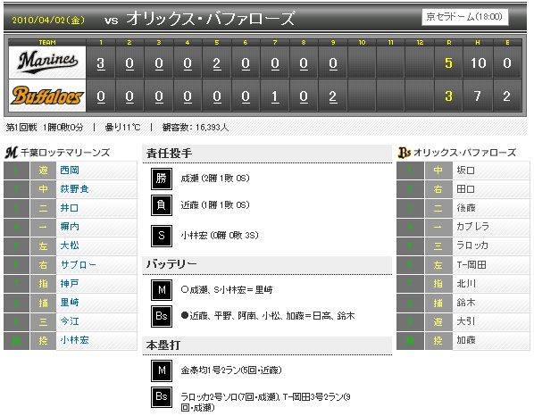 Marinesはエース・成瀬の先発ゲームとは言え、磐石の試合運びでものにしましたね。しかし、T-岡田の打撃は良いですね。最終回、成瀬の真ん中低めのストレート、コースは若干甘いですがあのカウントで投げ込めば並の打者なら三振か良くてフライを打ち上げるのが精一杯のボールです。それをしっかり捉えてバックスクリーン横まで持っていくしなやかなバッティングに、なにやら薄ら寒いものを感じてしまいました。