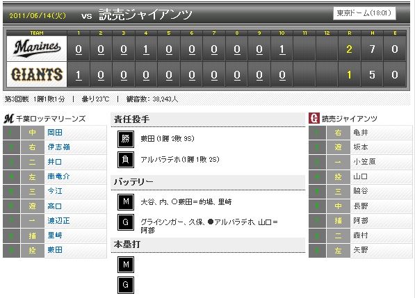 大谷の先発でキャッチャーが的場、ファーストに福浦ですから、スリーボーズの今季初そろい踏み(?)で、ご利益もあったのでしょうか。岡田の再三のスーパープレーとMarines以上に元気の無い讀賣打線にも助けられ、交流戦初の3連勝です。
